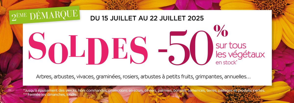 Du mardi 15 juillet 2025 au mardi 22 juillet 2025 inclus, les pépinières Allavoine vous invitent à profiter de sa deuxième démarque à −50 % sur une grande sélection de végétaux : arbres, arbustes, vivaces, graminées, rosiers, arbustes à petits fruits, grimpantes, annuelles... *jusqu'à épuisement des stocks