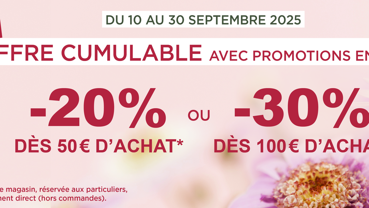 -20% dès 50% d'achat OU -30% dès 100€ d'achat