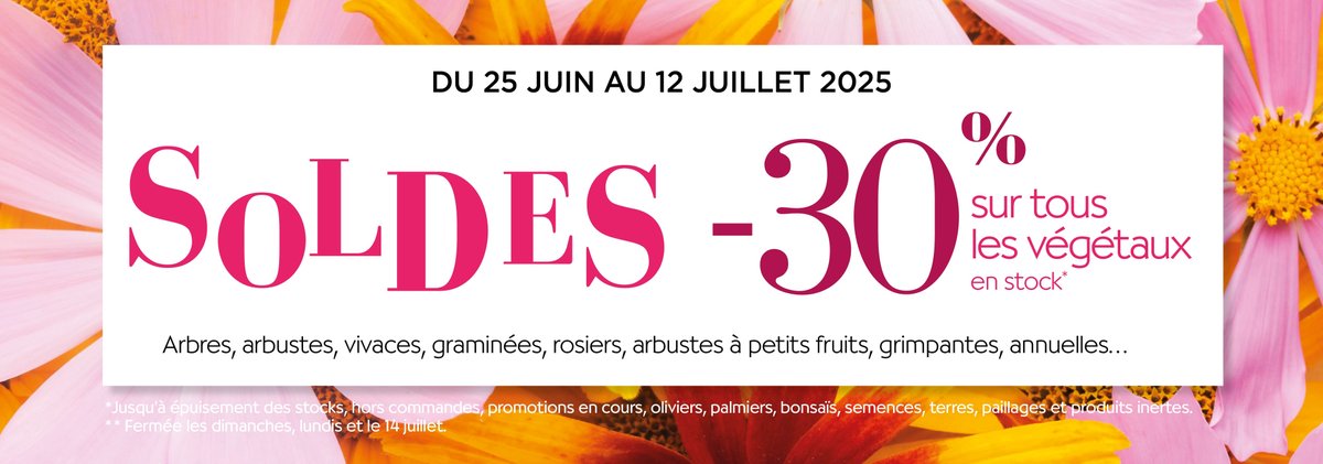 Nous sommes ravis de vous annoncer les soldes : – 30 % sur une vaste sélection de végétaux ! Profitez sans attendre de nos belles offres sur :
